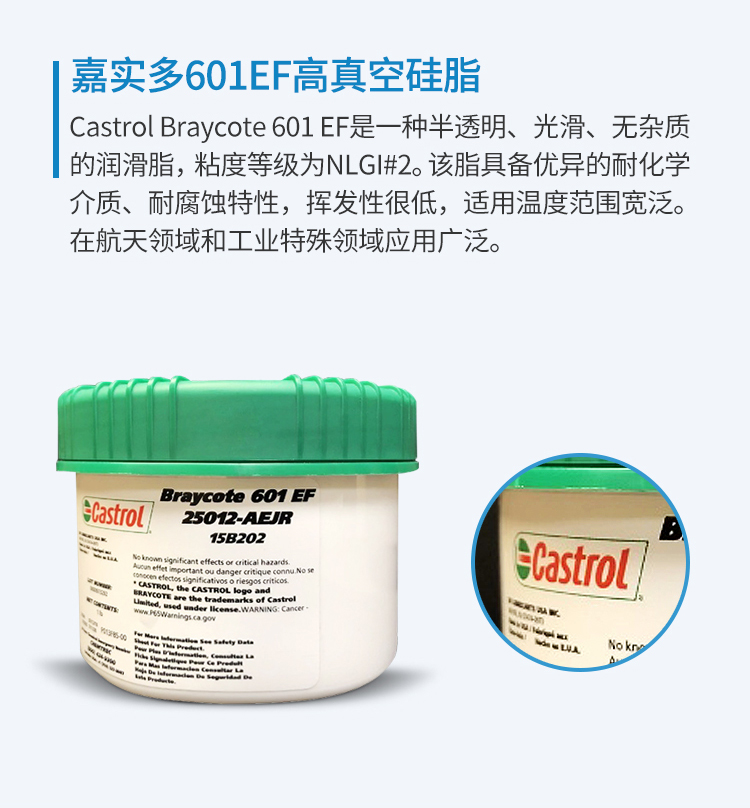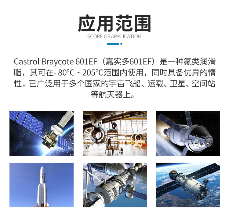 Castrol Braycote 601EF(嘉實多601EF)便是這樣的一種氟類潤滑脂,其可在- 80℃ ~ 205℃范圍內(nèi)使用,同時具備優(yōu)良的惰性,已廣泛用于多種飛船、運載火箭、衛(wèi)星、空間站等航天器上。