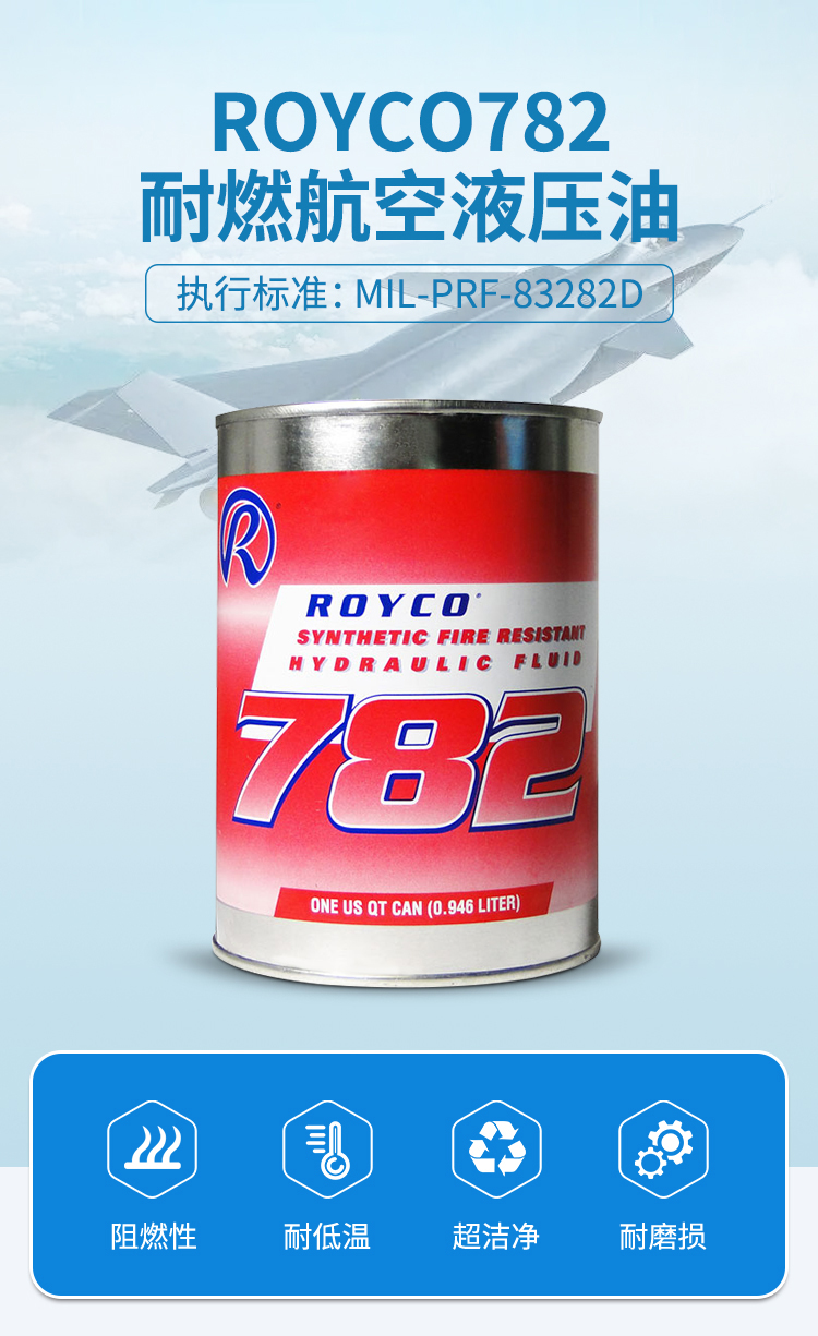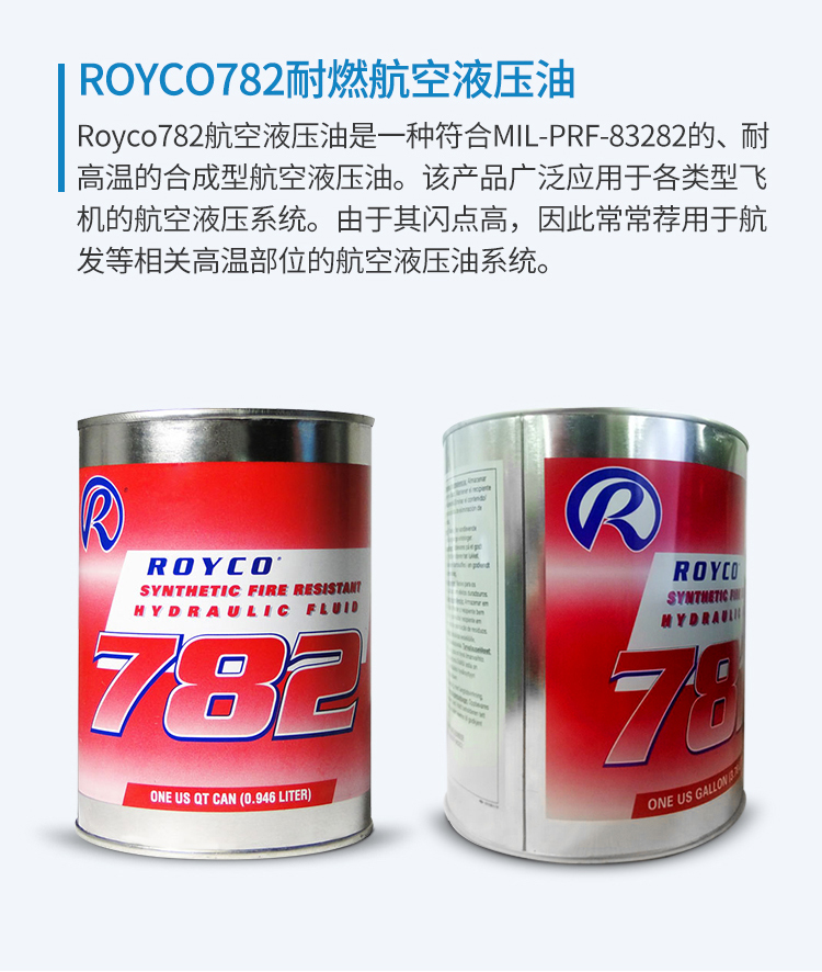 Royco782航空液壓油是一種符合MIL-PRF-83282的、耐高溫的合成型航空液壓油。該產(chǎn)品廣泛應(yīng)用于各類型飛機的航空液壓系統(tǒng)。由于其閃點高,因此常常薦用于航發(fā)等相關(guān)高溫部位的航空液壓油系統(tǒng)。