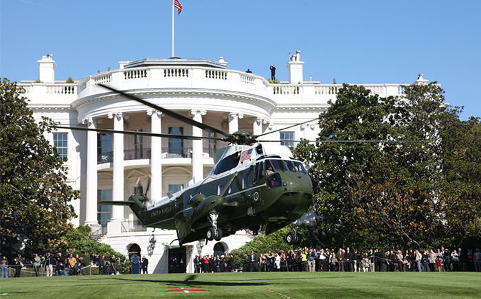 圖片為2008年10月31日,小布什和勞拉·布什夫人乘坐海軍陸戰隊一號離開白宮南草坪,前往戴維營。而當他需要進行遠程旅途時,會在白宮南草坪乘坐直升機前往安德魯斯空軍基地,空軍一號正在那里等候。當空軍一號將其送到目的地的機場后,海軍陸戰隊一號將其從機場送到他想要去的地方。