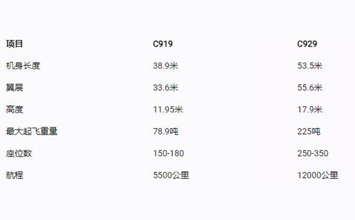 C919是一款中短程窄體客機(jī),而C929是一款遠(yuǎn)程寬體客機(jī),因此C929的機(jī)身長(zhǎng)度、翼展、高度、最大起飛重量、座位數(shù)和航程都比C919大很多。具體數(shù)據(jù)如下圖所示: