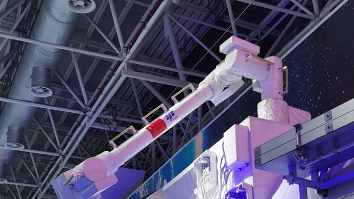 除了主要的艙體之外,我們在現(xiàn)場還可以看到包括太陽機(jī)翼、中繼天線、對接機(jī)構(gòu)、大小機(jī)械臂、艙內(nèi)實(shí)驗(yàn)機(jī)柜等配套設(shè)備。這些外部設(shè)置中,空間站機(jī)械臂十分吸引我們的眼球。